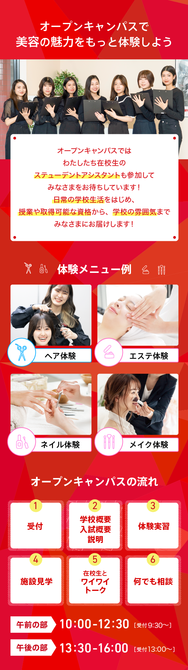3/14 (土) 午前の部10:00 - 12:30 (受付9:30~) 午後の部13:30 - 16:00(受付13:00~) 体験実習メニュー 美容に興味のある高校2年生のみなさん!岩谷学園のオーキャンに参加しよう✨✨ 午前の部に参加 午後の部に参加 3/14(土) オープンキャンパスの詳細