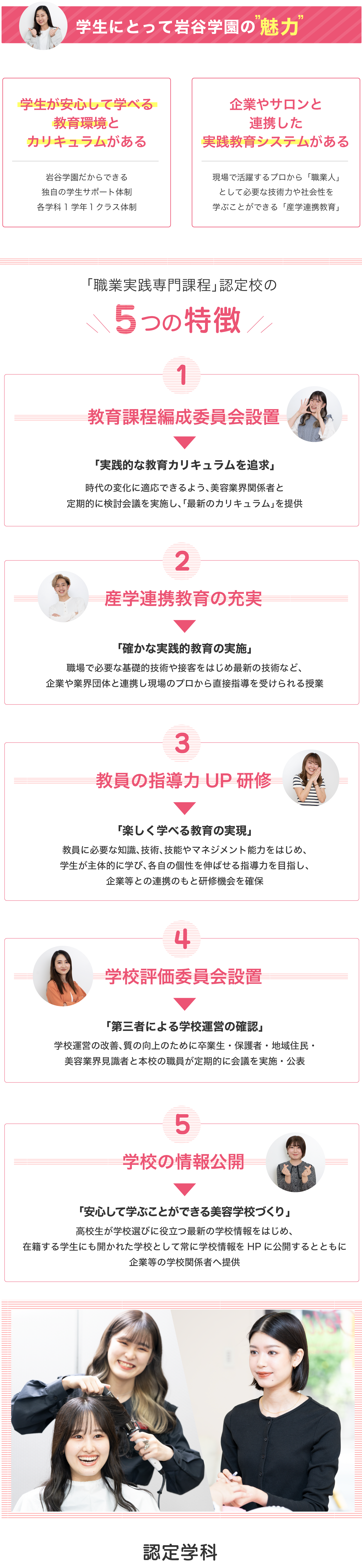 さまざまな企業やサロンと連携したカリキュラム作成や、実習・演習等を実施しています。このため、実際に「働く」ことを意識しながら、実践的かつ専門的な知識・技能を身につけることができます。 また、学校評価や情報開示にも積極的に取り組んでおり、就職状況や退学率等についてもホームページで公開しています。