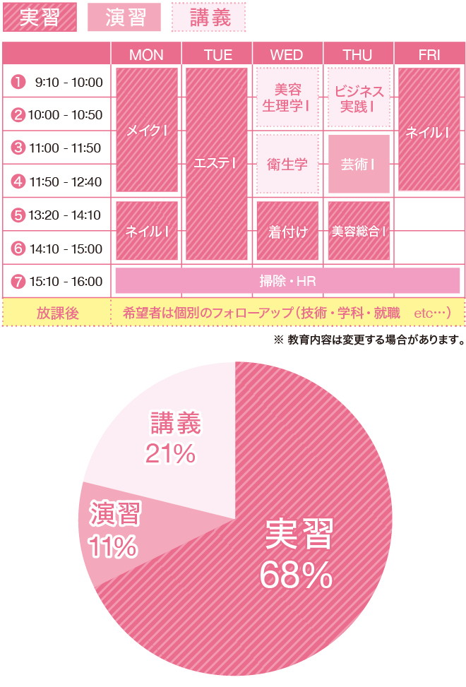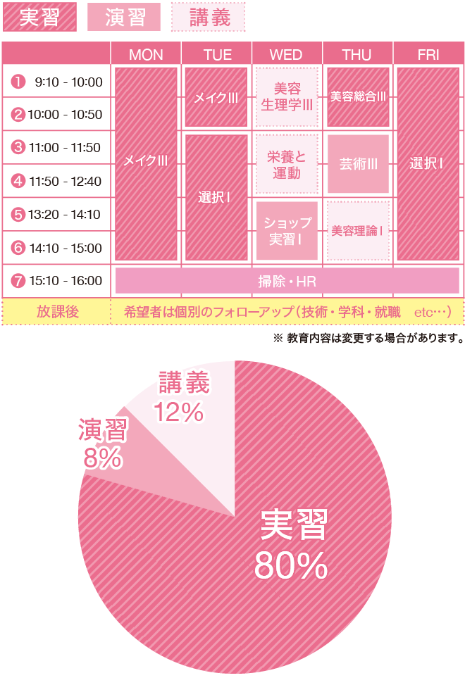 ※学校行事は時間割以外にも予定されています。(オリエンテーション・学園祭・作品発表・交流会・バーベキュー・コンテスト・校外授業等)年により内容変更もあります。