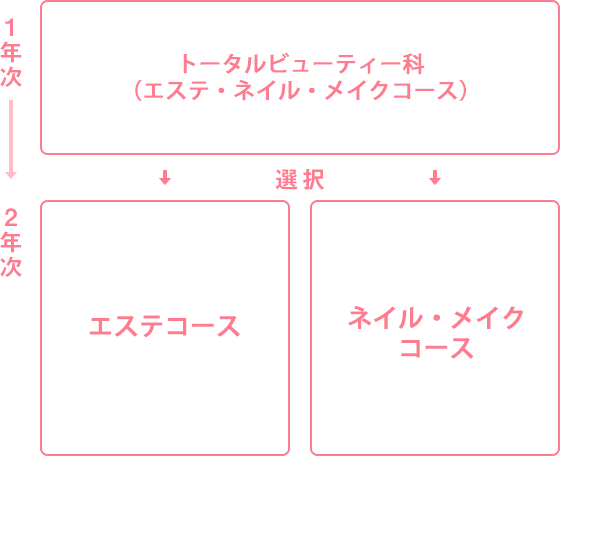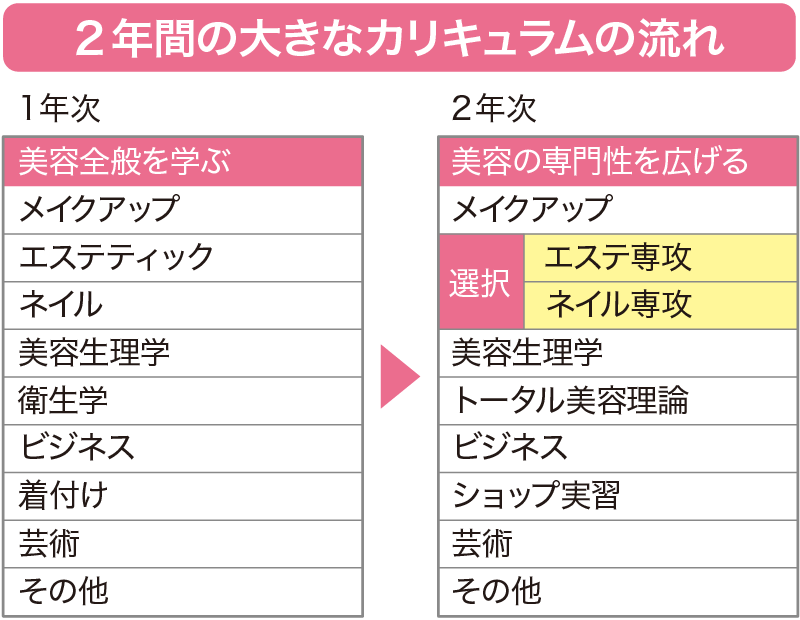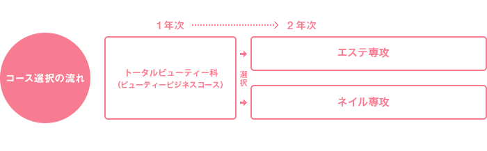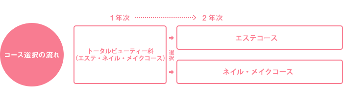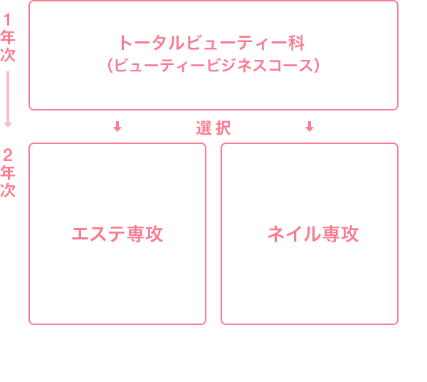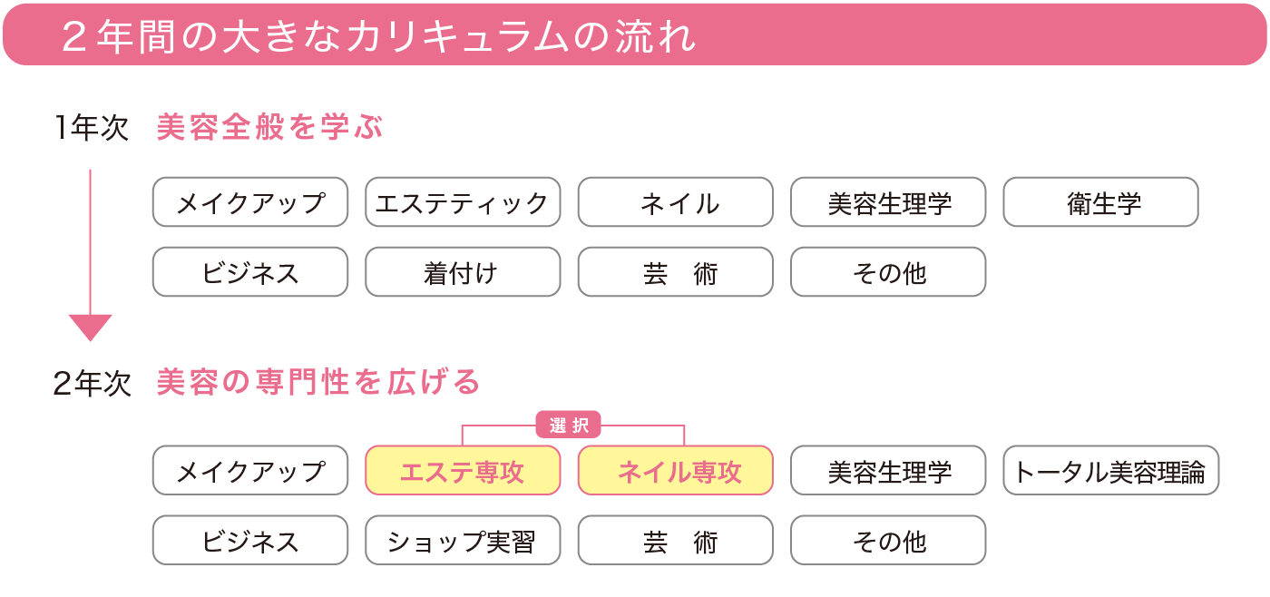 トータルビューティー科ビューティービジネスコースの1年次はトータルビューティーに関わる基礎を学習し、2年次で希望する選択科目(エステ・ネイル)により専門性を高めます。