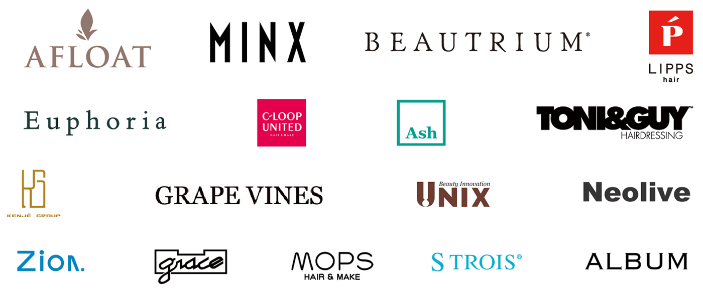 - OCEAN TOKYO / AFLOAT / MINX / GRAPEVINES / MOPS / シーホースジャパン / アースホールディングス / KENJE / UNIX / C-LOOP UNITED / アッシュ / クロードモネ / イートンクロップ / Neolive / 美容室ネムノキ / パームパム / ブラオヴィーゼ / 11cut / CLAPS / 美容室ZIP / beaut1/2 / 美容室Ibah / ヴィーナス美容室 / 小島ヘアープロジェクト / ヴァンカウンシル / ビューティーシルク / mic link / bianca / KAI HAIR / ティー・ライズ / ソシエ・ワールド / アアルト / HAIR’S i-Le / QUATRO / ユーアイ・コーポレーション / ヨコタコーポレーション / le jardin / mu;d / Produce / AIR BERRY / Cierge / bi:hair / BPJ’S / Beauty salon yuki / ビーアップクロード / jellicle / プロス / HAIR&MAKE EARTH / mod’s hair / リンクス / TONI&GUY / HAIR STAGE ZEAL / 資生堂美容室 / PROGRESS / Zeal / IMAGE-A / Max’s / ユーフォリア / 牛若丸 / ZEST / SICグループ / スパイス / レッシュブ / エスタシオ / neizy / ブエノスカリン / フレイス / BEAUTRIUM / ディ・シェーレ / アンベリール / Resistance / ACQUA / grace / ALBUM / Euphoria / 他多数 ■その他 TRU eyelash / AMERI eye+ / エストロワ