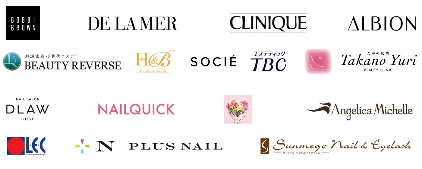 - コーセーアディクション / マックスファクター / ファンケル / 日本ロレアル / エスティローダー / シャネル / クリスチャンディオール / クリニーク / ジバンシィ / イプサ / アユーラ / ポーラ / Too Faced / ALBION / ヘレナルビンスタイン / マリークワント / プリスクリプティブ / シーボン フェイシャルサロン / PKMメディカルラボ / DHC / ピアスグループ / カネボウ化粧品 / 花王カスタマーマーケティング / TASHIRO / アトリエはるか / AVEDA / イセタンミラー / ドゥ・ラ・メール / コスメネクスト / イヴ・サンローラン・ボーテ / TOM FORD BEAUTY / BOBBI BROWN / DE LA MER / 他多数